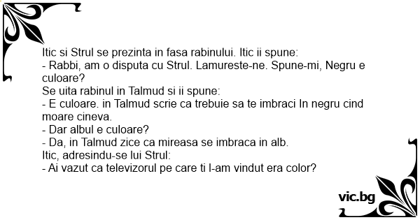 - Rabbi, am o disputa cu Strul. Lamureste-ne. Spune-mi, Negru e culoare?