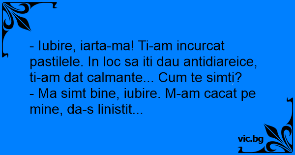 - Iubire, iarta-ma! Ti-am incurcat pastilele. In loc sa iti dau antidiareice, ti-am dat calmante... Сuм te simti?