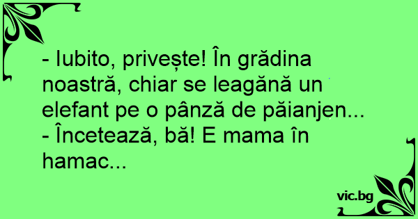 - Iubito, privește! În grădina noastră, chiar se leagănă un elefant pe o pânză de păianjen...