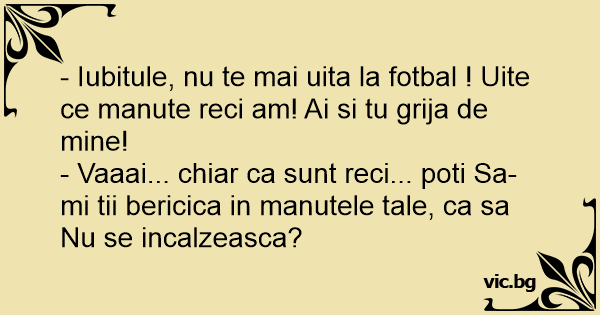 - Iubitule, nu te mai uita la fotbal ! Uite ce manute reci am! Ai si tu grija de mine!