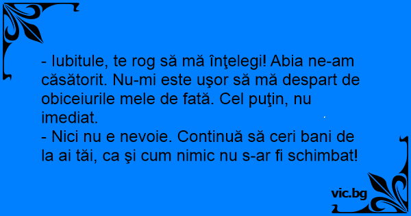 - Iubitule, te rog să mă înţelegi! Abia ne-am căsătorit. Nu-mi este uşor să mă despart de obiceiurile mele de fată. Cel puţin, nu imediat.
