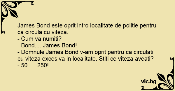 - Domnule James Bond v-am oprit pentru ca circulati cu viteza excesiva in localitate. Stiti ce viteza aveati?
