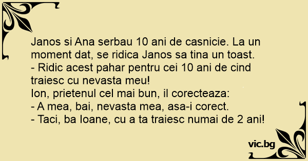 Janos si Ana serbau 10 ani de casnicie. La un moment dat, se ridica Janos sa tina un toast.