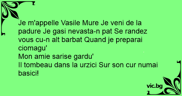 Je m'appelle Vasile Mure Je veni de la padure Je gasi nevasta-n pat Se randez vous cu-n alt barbat Quand je preparai ciomagu'