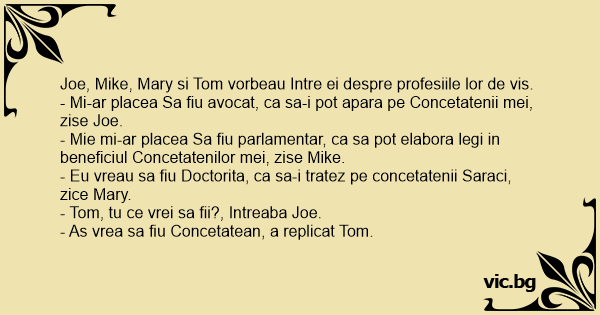- Mie mi-ar placea Sa fiu parlamentar, ca sa рот elabora legi in beneficiul Concetatenilor mei, zise Mike.