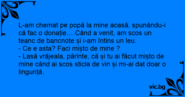 - Lasă vrăjeala, părinte, că și tu ai făcut mișto de mine când ai scos sticla de vin și mi-ai dat doar o linguriță.