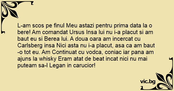 L-am scos pe finul Meu astazi pentru prima data la o bere! Am comandat Ursus Insa lui nu i-a placut si am baut eu si Berea lui. A doua oara am incercat cu Carlsberg insa Nici asta nu i-a placut, asa ca am baut-o tot eu. Am Continuat cu vodca, coniac iar pana am ajuns la whisky Eram atat de beat incat nici nu mai puteam sa-l Legan in carucior!
