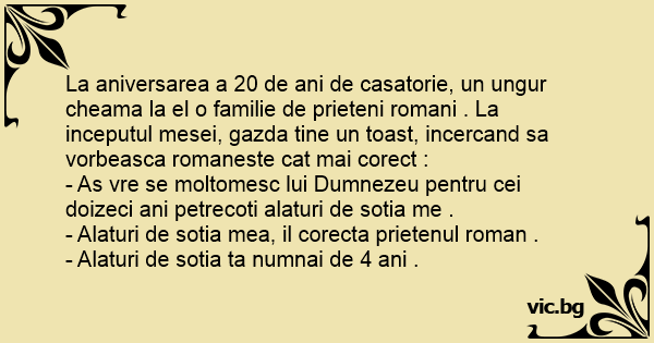 La aniversarea a 20 de ani de casatorie, un ungur cheama la el o familie de prieteni romani . La inceputul mesei, gazda tine un toast, incercand sa vorbeasca romaneste cat mai corect :