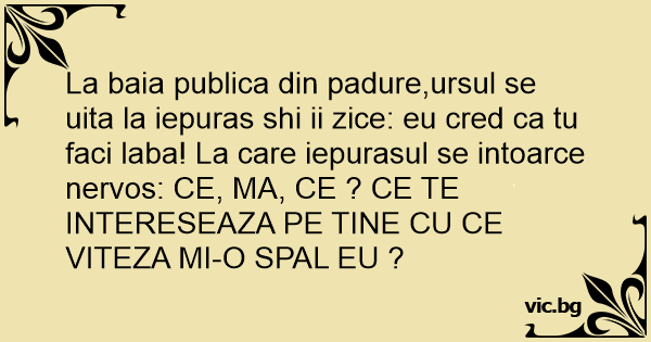 La baia publica din padure,ursul se uita la iepuras shi ii zice: eu cred ca tu faci laba! La care iepurasul se intoarce nervos: CE, MA, CE ? CE TE INTERESEAZA PE TINE CU CE VITEZA MI-O SPAL EU ?