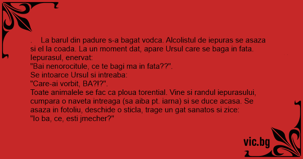 . La barul din padure s-a bagat vodca. Alcolistul de iepuras se asaza si el la coada. La un moment dat, apare Ursul care se baga in fata.