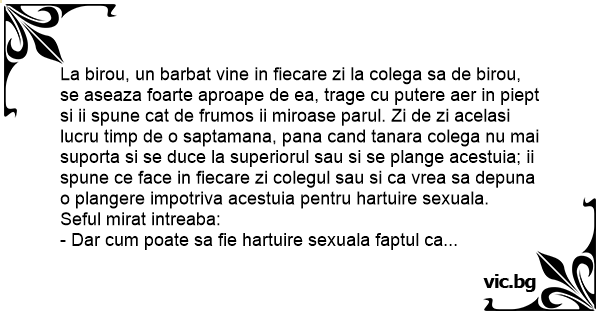- Spune-mi, te rog, atunci cand un om spune ca parul meu miroase frumos, e hartuire sau nu? - Nu, in opinia mea este un compliment. - Si daca omul este pitic?!...