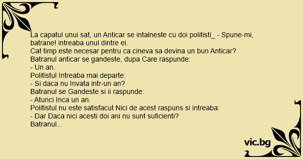 La capatul unui sat, un Anticar se intalneste cu doi politisti_ - Spune-mi, batrane! intreaba unul dintre ei.