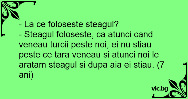 - Steagul foloseste, ca atunci cand veneau turcii peste noi, ei nu stiau peste ce tara veneau si atunci noi le aratam steagul si dupa aia ei stiau. (7 ani)