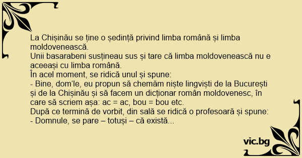 - Bine, dom‘le, eu propun să chemăm niște lingviști de la București și de la Chișinău și să facem un dicționar român moldovenesc, în care să scriem așa: ac = ac, bou = bou etc.