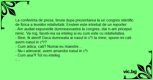 - Am audiat expunerile dumneavoastra la congres, dar n-am priceput nimic. Va rog, faceti-ma sa inteleg si eu сuм este cu relativitatea.