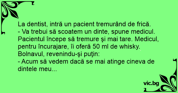 Pacientul începe să tremure şi mai tare. Medicul, pentru încurajare, îi oferă 50 ml de whisky. Bolnavul, revenindu-şi puţin: