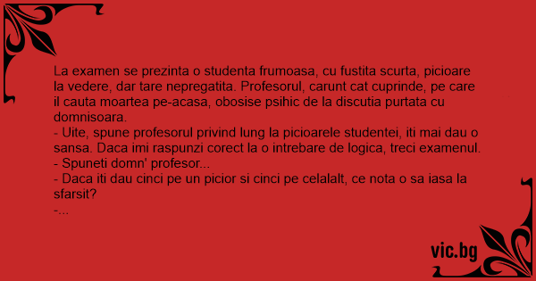 - Uite, spune profesorul privind lung la picioarele studentei, iti mai dau o sansa. Daca imi raspunzi corect la o intrebare de logica, treci examenul.