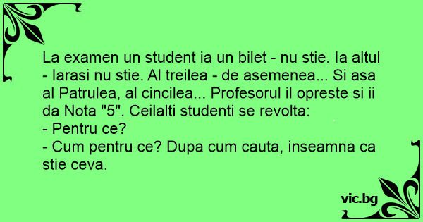 La examen un student ia un bilet - nu stie. Ia altul - Iarasi nu stie. Al treilea - de asemenea... Si asa al Patrulea, al cincilea... Profesorul il opreste si ii da Nota "5". Ceilalti studenti se revolta: