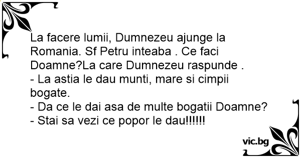 La facere lumii, Dumnezeu ajunge la Romania. Sf Petru inteaba . Ce faci Doamne?La care Dumnezeu raspunde .