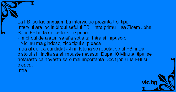 Interviul are loc in biroul sefului FBI. Intra primul - sa Zicem John. Seful FBI ii da un pistol si ii spune: