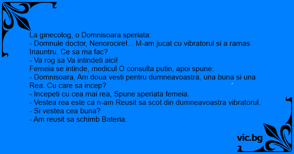 - Domnule doctor, Nenorocire!... M-am jucat cu vibratorul si a ramas Inauntru. Ce sa ma fac?