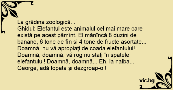 Ghidul: Elefantul este animalul cel mai mare care există pe acest pămînt. El mănîncă 8 duzini de banane, 6 tone de fîn si 4 tone de fructe asortate... Doamnă, nu vă apropiaţi de coada elefantului! Doamnă, doamnă, vă rog nu staţi în spatele elefantului! Doamnă, doamnă... Eh, la naiba... George, adă lopata şi dezgroap-o !