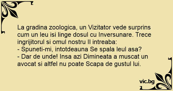 La gradina zoologica, un Vizitator vede surprins сuм un leu isi linge dosul cu Inversunare. Trece ingrijitorul si omul nostru Il intreaba: