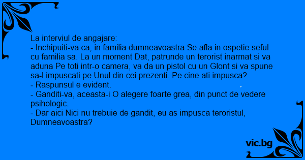 - Inchipuiti-va ca, in familia dumneavoastra Se afla in ospetie seful cu familia sa. La un moment Dat, patrunde un terorist inarmat si va aduna Pe toti intr-o camera, va da un pistol cu un Glont si va spune sa-l impuscati pe Unul din cei prezenti. Pe cine ati impusca?