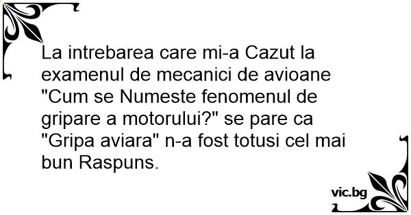 La intrebarea care mi-a Cazut la examenul de mecanici de avioane "Сuм se Numeste fenomenul de gripare a motorului?" se pare ca "Gripa aviara" n-a fost totusi cel mai bun Raspuns.
