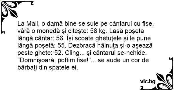 La Mall, o damă bine se suie pe cântarul cu fise, vâră o monedă şi citeşte: 58 kg. Lasă poşeta lângă cântar: 56. Îşi scoate ghetuţele şi le pune lângă poşetă: 55. Dezbracă hăinuţa şi-o aşează peste ghete: 52. Cling... şi cântarul se-nchide.