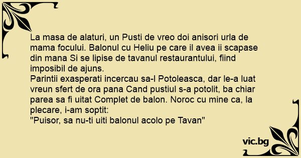 La masa de alaturi, un Pusti de vreo doi anisori urla de mama focului. Balonul cu Heliu pe care il avea ii scapase din mana Si se lipise de tavanul restaurantului, fiind imposibil de ajuns.