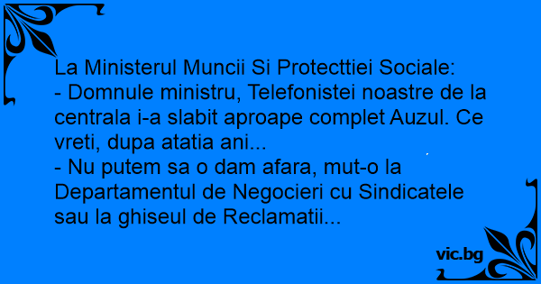 - Domnule ministru, Telefonistei noastre de la centrala i-a slabit aproape complet Auzul. Ce vreti, dupa atatia ani...