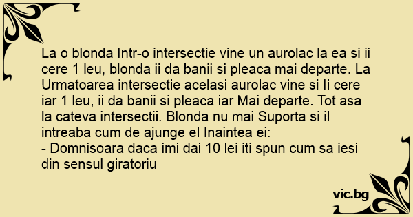 La o blonda Intr-o intersectie vine un aurolac la ea si ii cere 1 leu, blonda ii da banii si pleaca mai departe. La Urmatoarea intersectie acelasi aurolac vine si Ii cere iar 1 leu, ii da banii si pleaca iar Mai departe. Tot asa la cateva intersectii. Blonda nu mai Suporta si il intreaba сuм de ajunge el Inaintea ei: