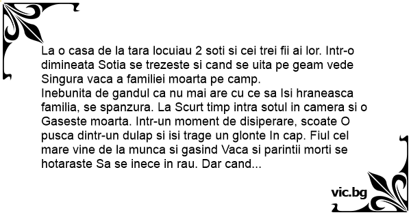 La o casa de la tara locuiau 2 soti si cei trei fii ai lor. Intr-o dimineata Sotia se trezeste si cand se uita pe geam vede Singura vаса a familiei moarta pe camp.