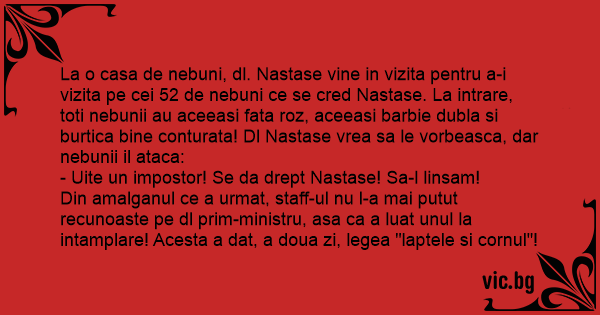 La o casa de nebuni, dl. Nastase vine in vizita pentru a-i vizita pe cei 52 de nebuni ce se cred Nastase. La intrare, toti nebunii au aceeasi fata roz, aceeasi barbie dubla si burtica bine conturata! Dl Nastase vrea sa le vorbeasca, dar nebunii il ataca: