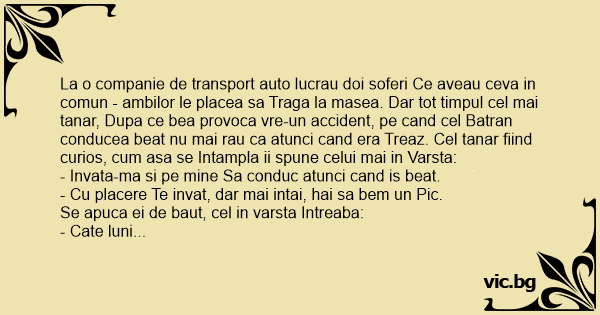 La o companie de transport auto lucrau doi soferi Ce aveau ceva in comun - ambilor le placea sa Traga la masea. Dar tot timpul cel mai tanar, Dupa ce bea provoca vre-un accident, pe cand cel Batran conducea beat nu mai rau ca atunci cand era Treaz. Cel tanar fiind curios, сuм asa se Intampla ii spune celui mai in Varsta: