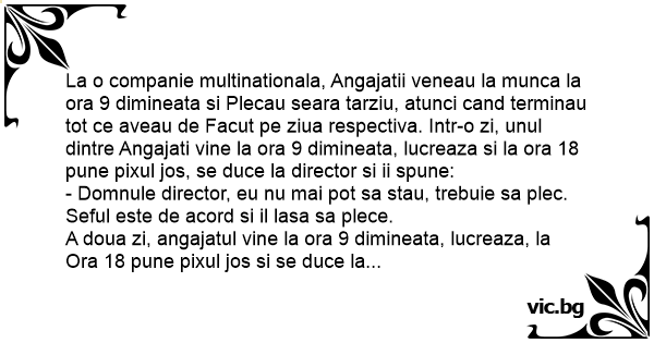La o companie multinationala, Angajatii veneau la munca la ora 9 dimineata si Plecau seara tarziu, atunci cand terminau tot ce aveau de Facut pe ziua respectiva. Intr-o zi, unul dintre Angajati vine la ora 9 dimineata, lucreaza si la ora 18 pune pixul jos, se duce la director si ii spune: