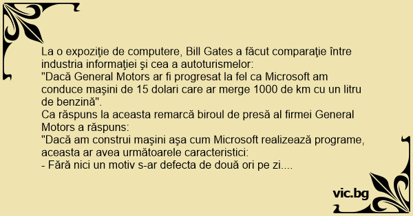 "Dacă General Motors ar fi progresat la fel ca Microsoft am conduce maşini de 15 dolari care ar merge 1000 de km cu un litru de benzină".
