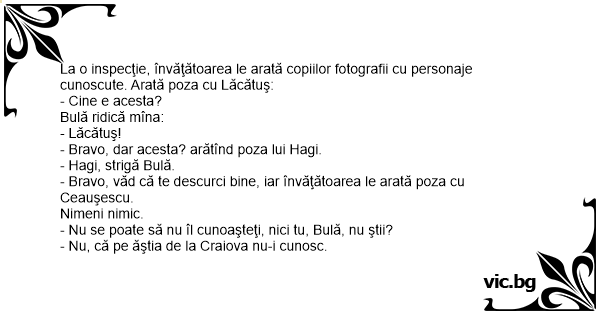- Bravo, văd că te descurci bine, iar învăţătoarea le arată poza cu Ceauşescu.