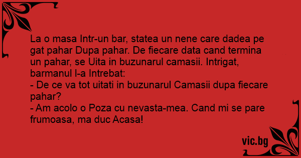 La o masa Intr-un bar, statea un nene care dadea pe gat pahar Dupa pahar. De fiecare data cand termina un pahar, se Uita in buzunarul camasii. Intrigat, barmanul l-a Intrebat: