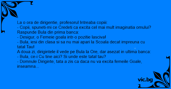 - Domnule Diriginte, tata a zis ca daca nu va excita femeile Goale, inseamna ca sunteti homosexual si el nu Vrea sa discute cu homosexualii. Si stau aici pentru ca Mi-a recomandat si mie sa stau cat mai departe de Dumneavoastra!
