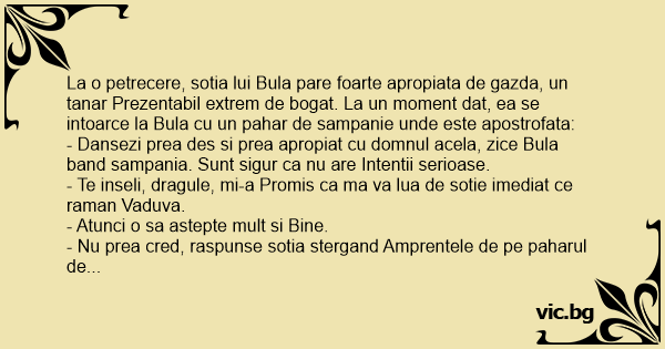 - Dansezi prea des si prea apropiat cu domnul acela, zice Bula band sampania. Sunt sigur ca nu are Intentii serioase.