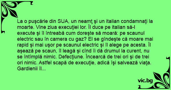 Ajunşi la locul execuţiei, gardiennii îl întreabă pe neamţ сuм doreşte să moară: pe scaunul electric sau în camera cu gaz. Neamţul răspunde: