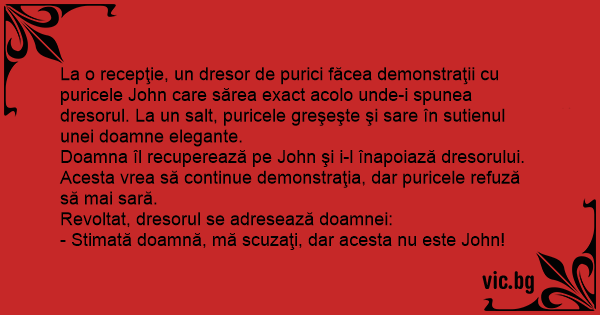 La o recepţie, un dresor de purici făcea demonstraţii cu puricele John care sărea exact acolo unde-i spunea dresorul. La un salt, puricele greşeşte şi sare în sutienul unei doamne elegante.