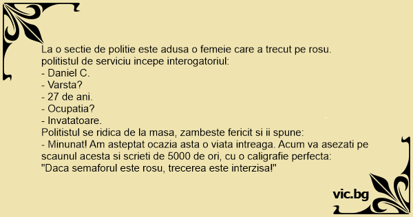 La o sectie de politie este adusa o femeie care a trecut pe rosu. politistul de serviciu incepe interogatoriul: