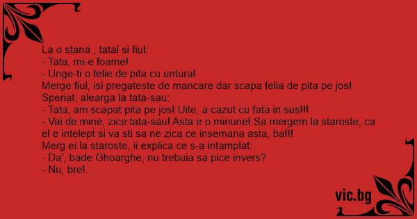 - Tata, am scapat pita pe jos! Uite, a cazut cu fata in sus!!!
