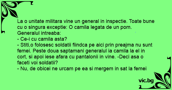 La o unitate militara din desert vine un nou comandant. Vazand tipu' o camila legata de un stalp, intreaba ce-i cu ea. - Pai, stiti domn' sef, raspunde unul mai indraznet, cand mai avem novoie de...