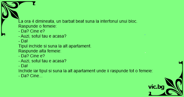 Inchide iar tipul si suna la alt apartament unde ii raspunde tot o femeie: