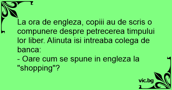 La ora de engleza, copiii au de scris o compunere despre petrecerea timpului lor liber. Alinuta isi intreaba colega de banca: