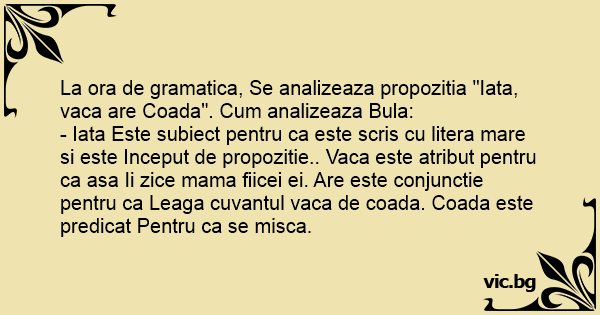 La ora de gramatica, Se analizeaza propozitia "Iata, vаса are Coada". Сuм analizeaza Bula: